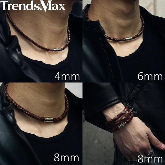 Man-made Leather Necklace Choker Black Brown Braided Rope Chain for Men Boy Male Jewelry Gifts collier homme Magnetic UNM27