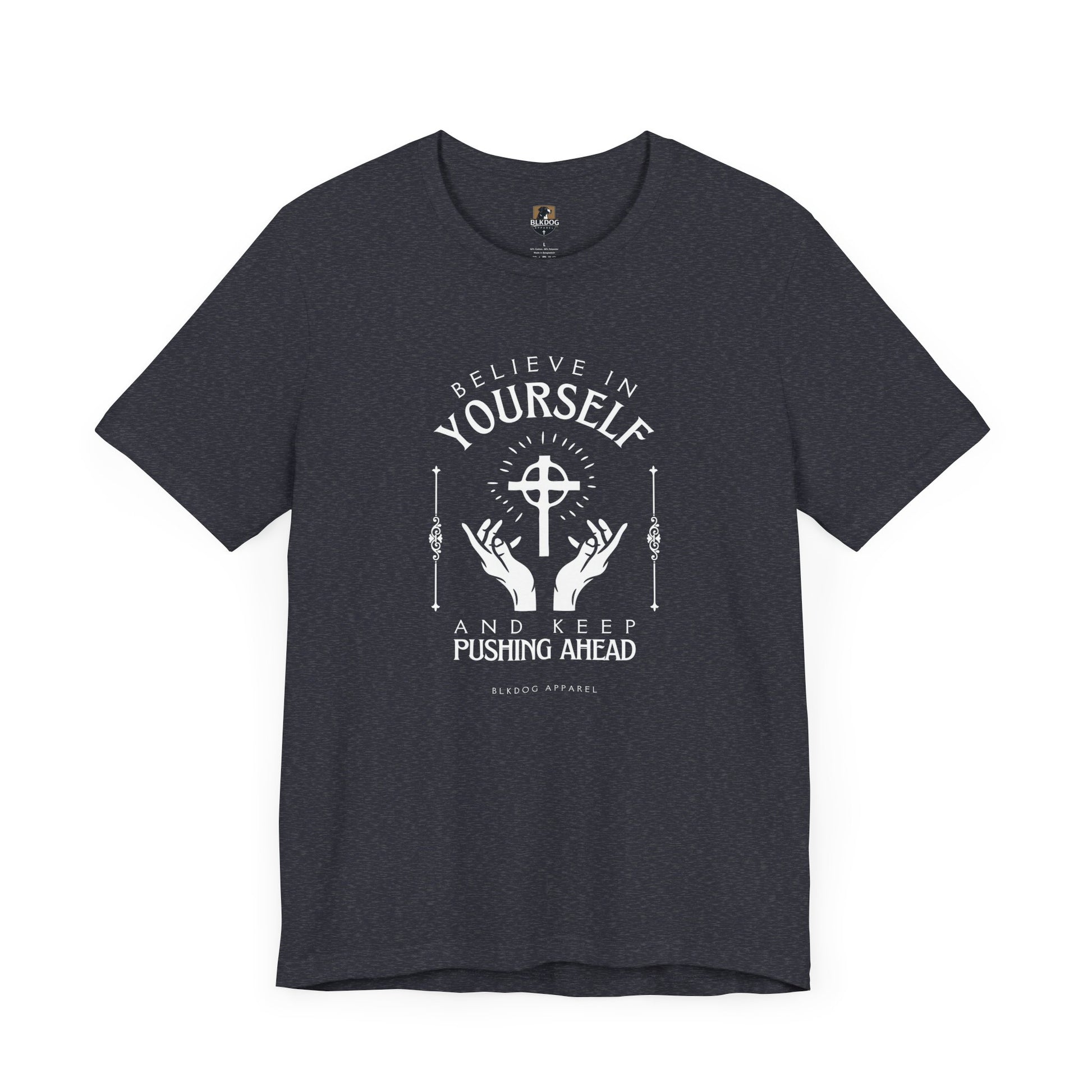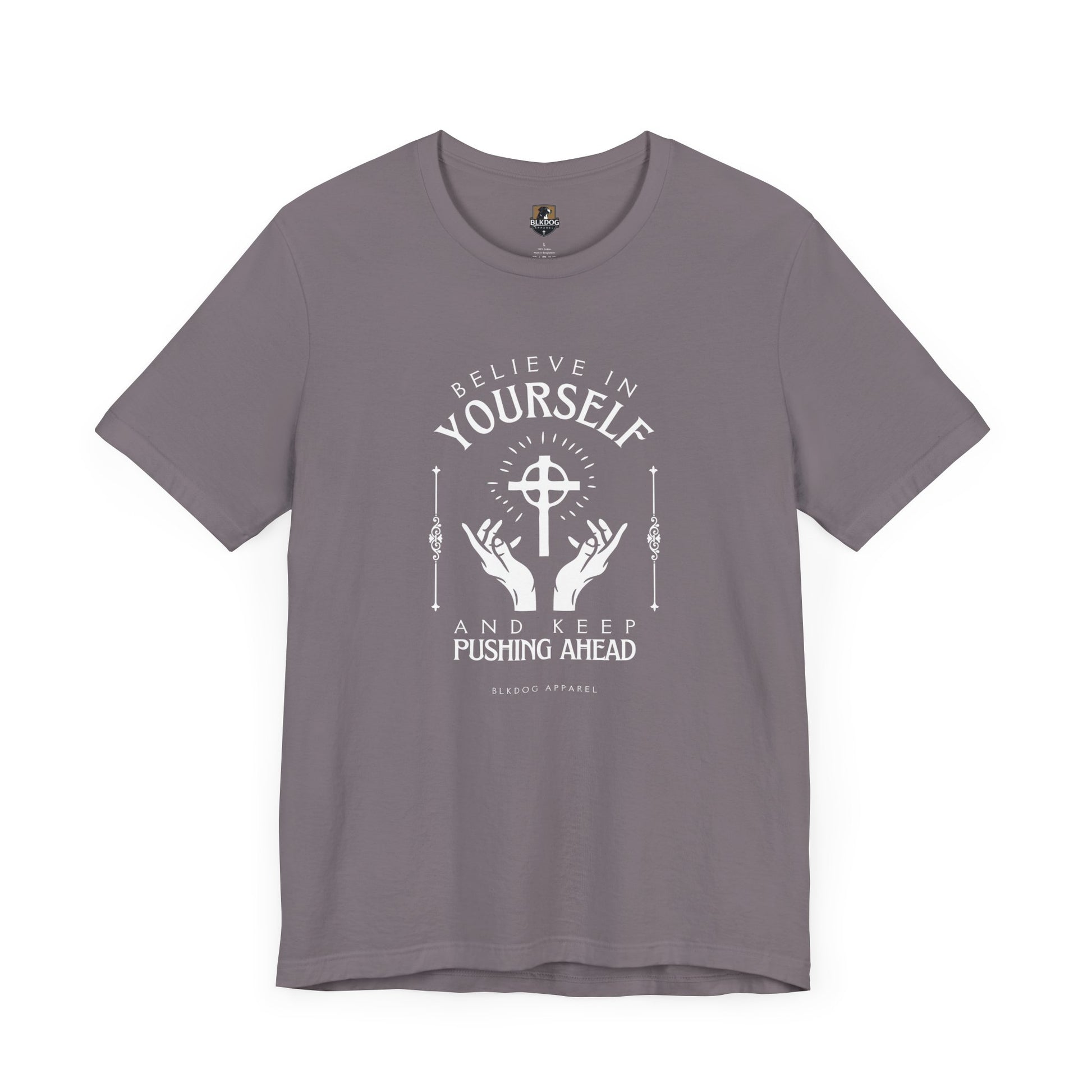 A motivational T-Shirt with the phrase 'believe in yourself and keep pushing ahead'. This comfy and lightweight T-Shirt is perfect for everyday wear, inspiring confidence and positivity. Ideal for individuals looking for a daily reminder to stay motivated and focused on their goals. Great for gifts on birthdays, graduations, and other special occasions. Product features - Made with 100% Airlume combed and ring-spun cotton for breathability and comfort - Retail fit for casual and semi-formal settings - Manufactured by Bella+Canvas in a humane and sustainable way - Tear-away label for minimal skin irritations - Various fabric blends available for different color options Care instructions - Machine wash: cold (max 30C or 90F) - Non-chlorine: bleach as needed - Tumble dry: low heat - Iron, steam or dry: medium heat - Do not dry-clean