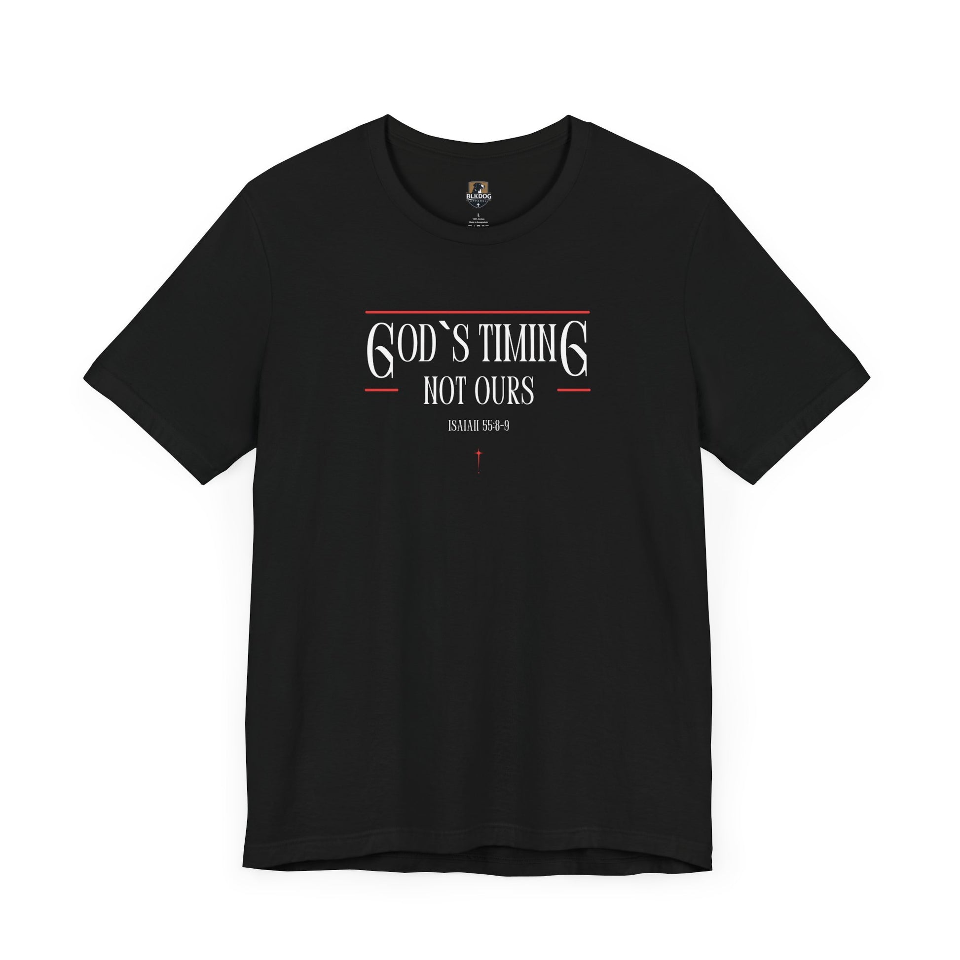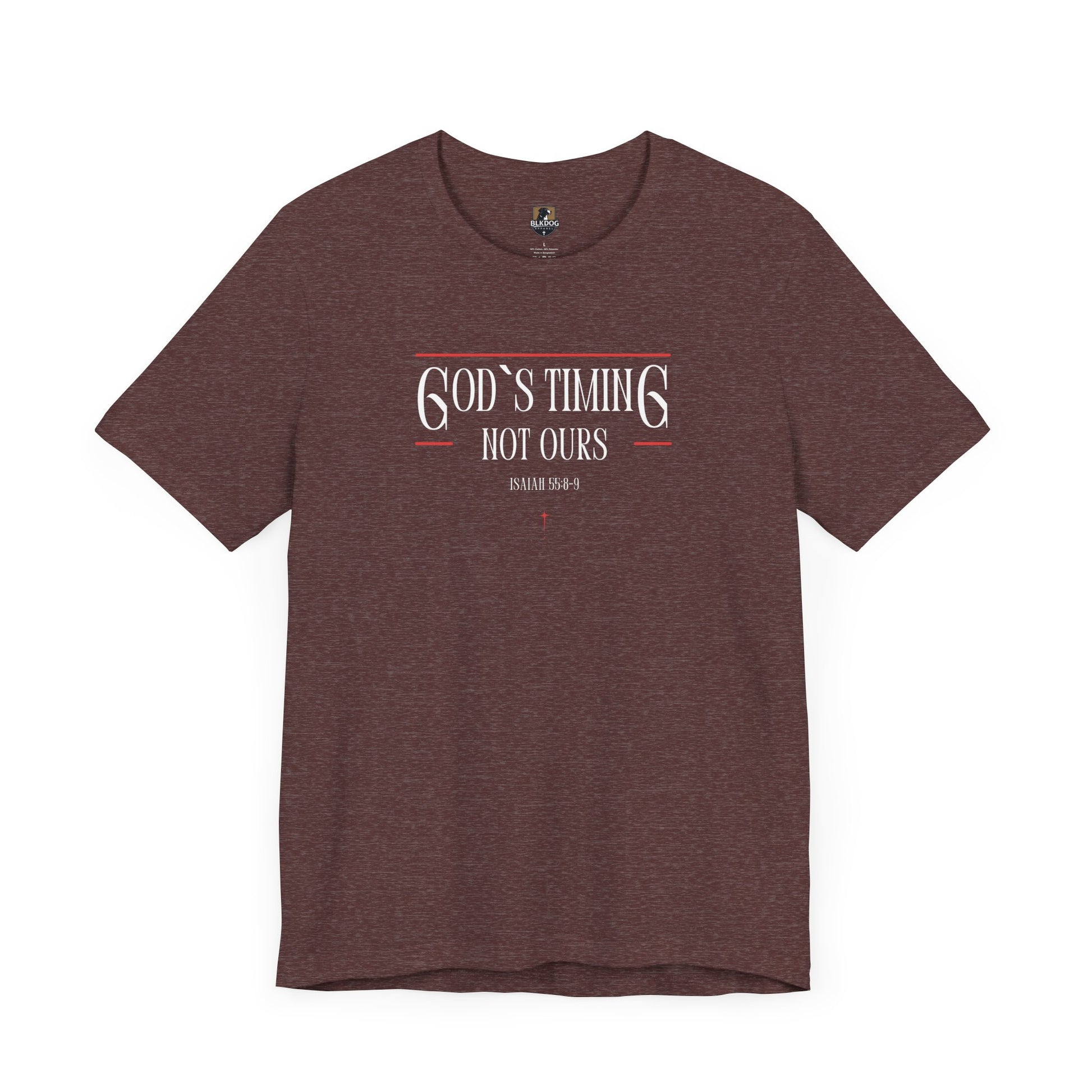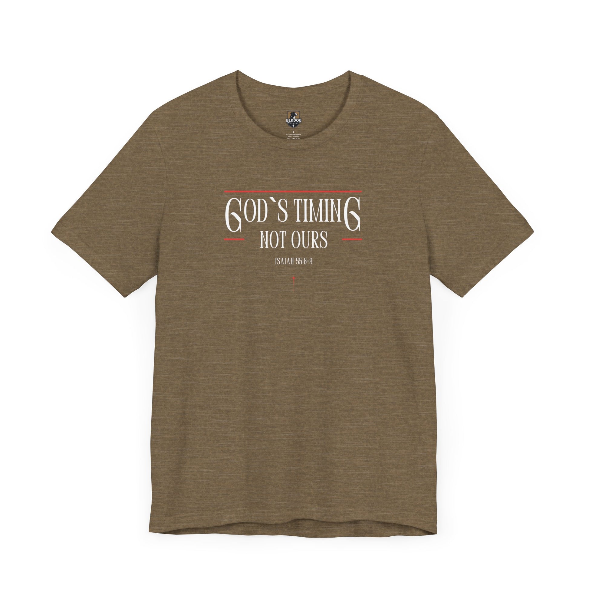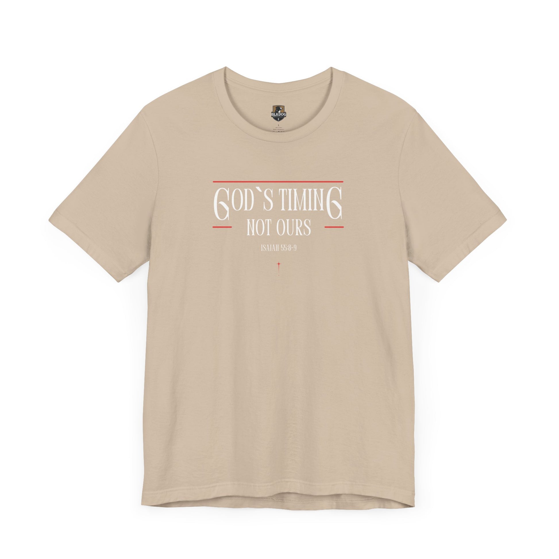 This T-Shirt features the message 'God's Timing Not Ours'. It gives a sense of hope and faith, making it a perfect addition to a buyer's wardrobe for daily wear or special occasions. Relevant for Christian holidays and celebrations. Product features - 100% Airlume combed and ring-spun cotton - Retail fit for casual and semi-formal settings - Side seams for structural support - Shoulder tape for stabilization - Direct-to-Film printing for crisp designs Care instructions - Machine wash: cold (max 30C or 90F) - Non-chlorine: bleach as needed - Tumble dry: low heat - Iron, steam or dry: medium heat - Do not dry-clean