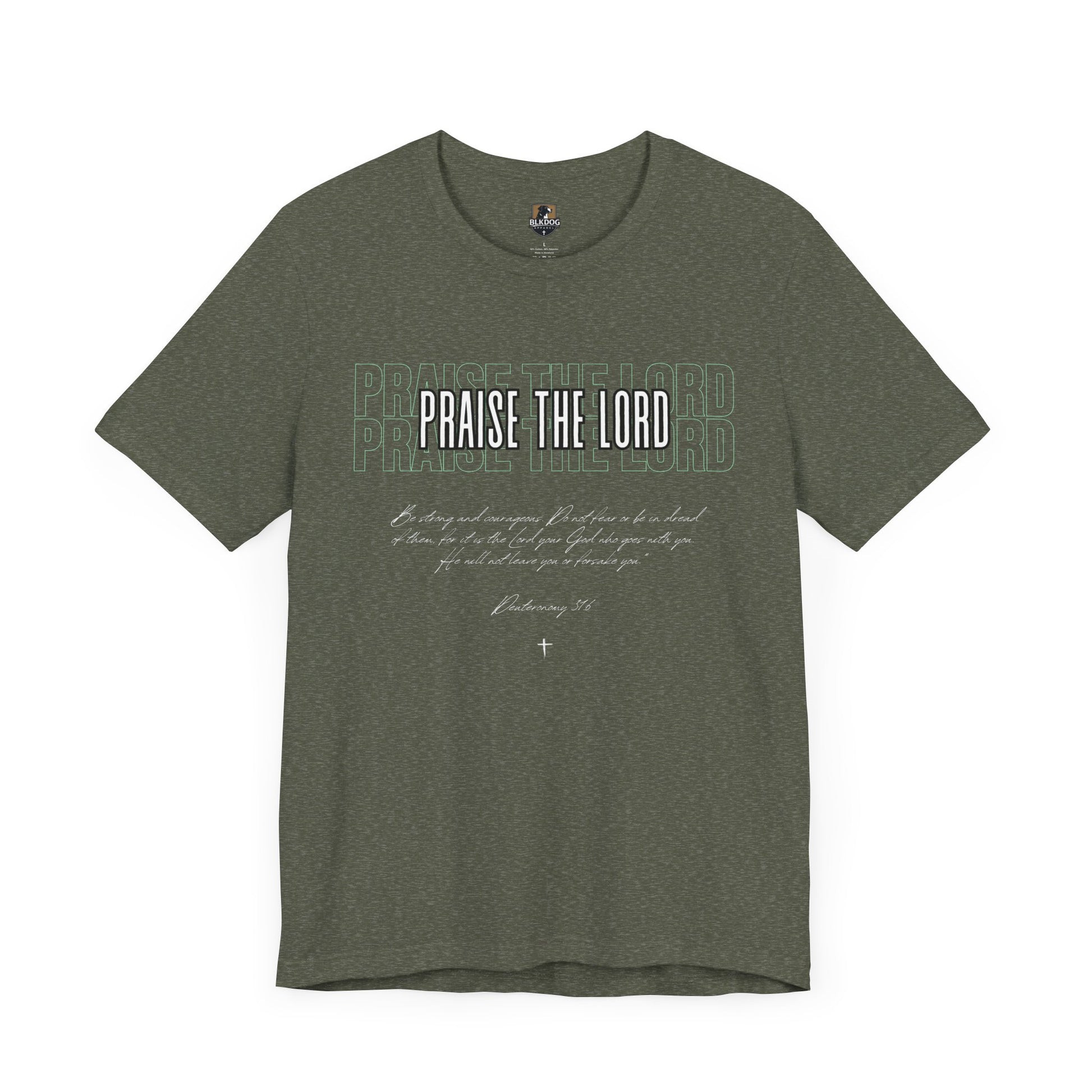 A unisex jersey short sleeve tee featuring the phrase 'Praise the Lord'. This tee exudes a positive and uplifting vibe, making it a great addition to any casual outfit. Perfect for those who want to express their faith and beliefs. Ideal for religious holidays, church events, and everyday wear. Product features - 100% Airlume combed and ring-spun cotton - Retail fit for casual and semi-formal settings - Direct-to-Garment sleeve printing for detailed designs - Shoulder tape for garment stability - Made by Bella+Canvas in a sustainable and humane way Care instructions - Machine wash: cold (max 30C or 90F) - Non-chlorine: bleach as needed - Tumble dry: low heat - Iron, steam or dry: medium heat - Do not dry-clean
